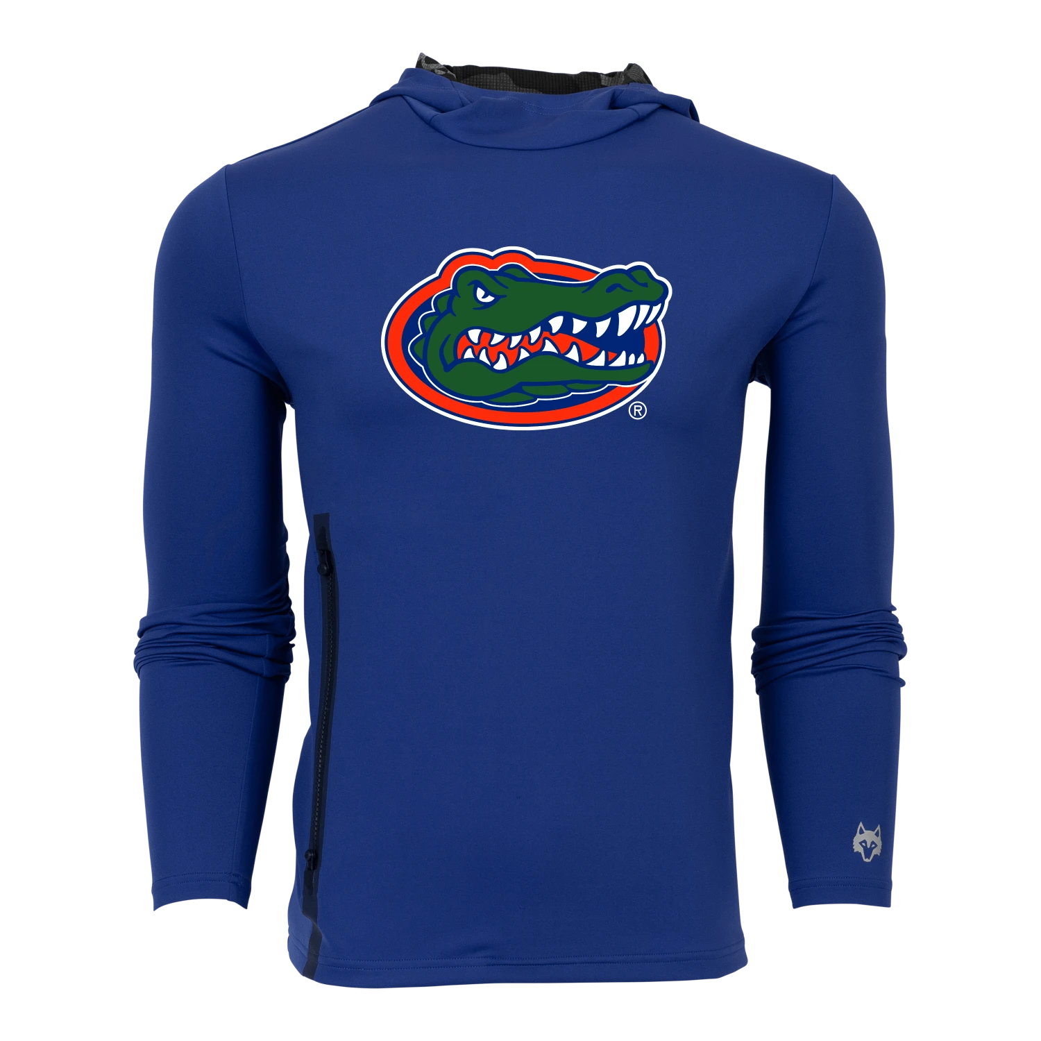 Constructed from a technical blend of nylon and elastane, the Florida Cokato Hoodie is the epitome of functional luxury. The brushback knit fabric is breathable, lightweight, and delivers a soft feel. Decorated with a perforated camo interior neck, blind seams, and an elongated utility pocket on the front right side of the garment. The hood is built as a funnel neck for warmth and style. Finished with the iconic reflective wolf on the left cuff. Decorated with Florida Gators artwork.