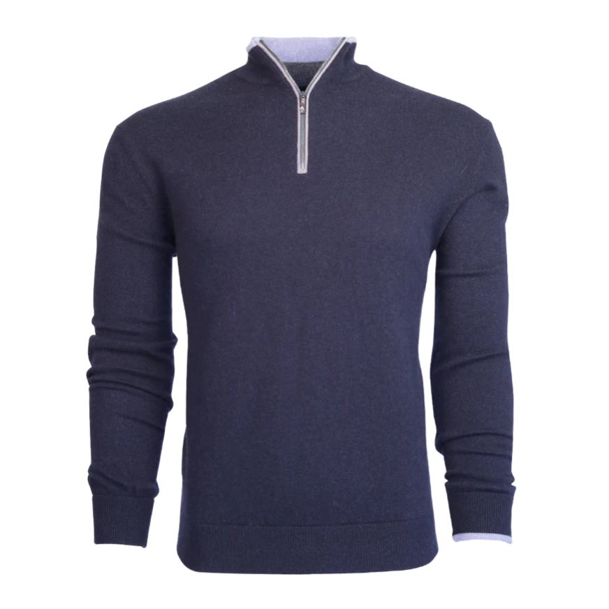 The Sebonack Quarter-Zip Sweater is crafted from a premium blend of wool and cashmere. Designed for buttery-soft comfort, this sweater keeps you light while providing warmth. Featuring a suede taping on the zipper placket and a crafted horn pull, it has Greyson’s signature color contrast tipping on the left sleeve. Finished with rib-knit sleeves, collar, and hem.